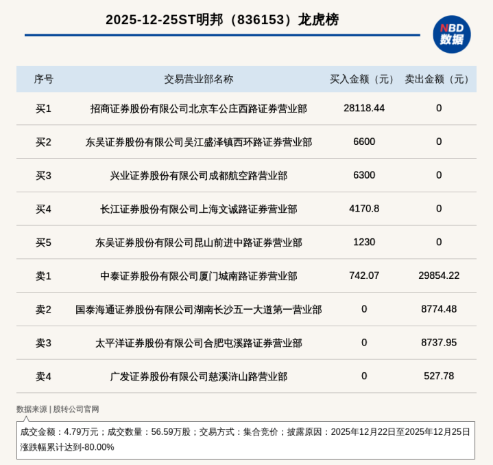 E融配资 新三板基础层公司ST明邦登龙虎榜: 2025年12月22日至2025年12月25日涨跌幅累计达到-80.00% 2025年 来源:萧山股票配资 网站:诚多网 日期:2026-01-05 12:14:07 查看:124